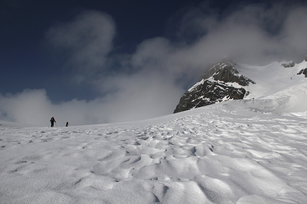 Auf der Ueberquerung des Chlaridengletschers treffen wir bizarre Schneeformationen an. Unser Weg geht rechts hinauf, auf das Teufelsjoch.