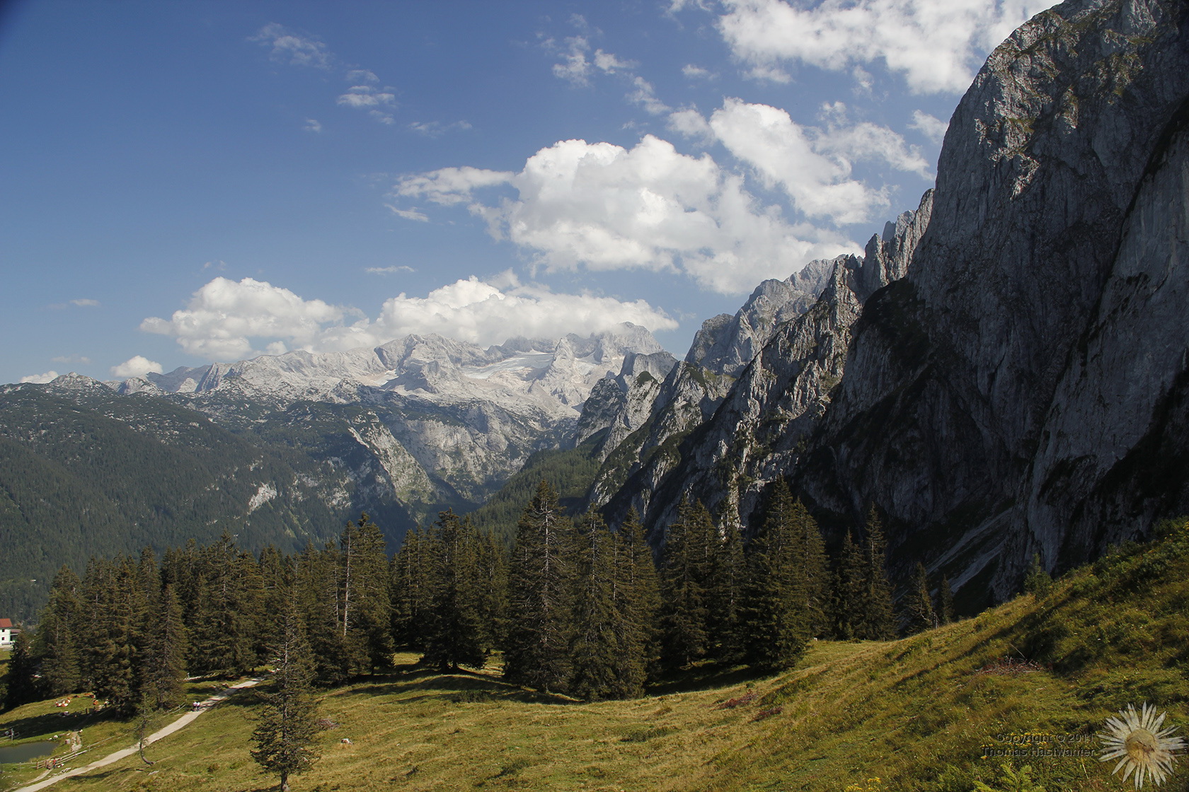 Dachsteinblick, von der Zwieselalmhütte. Rechts geht's hinauf zum Donnerkogel.