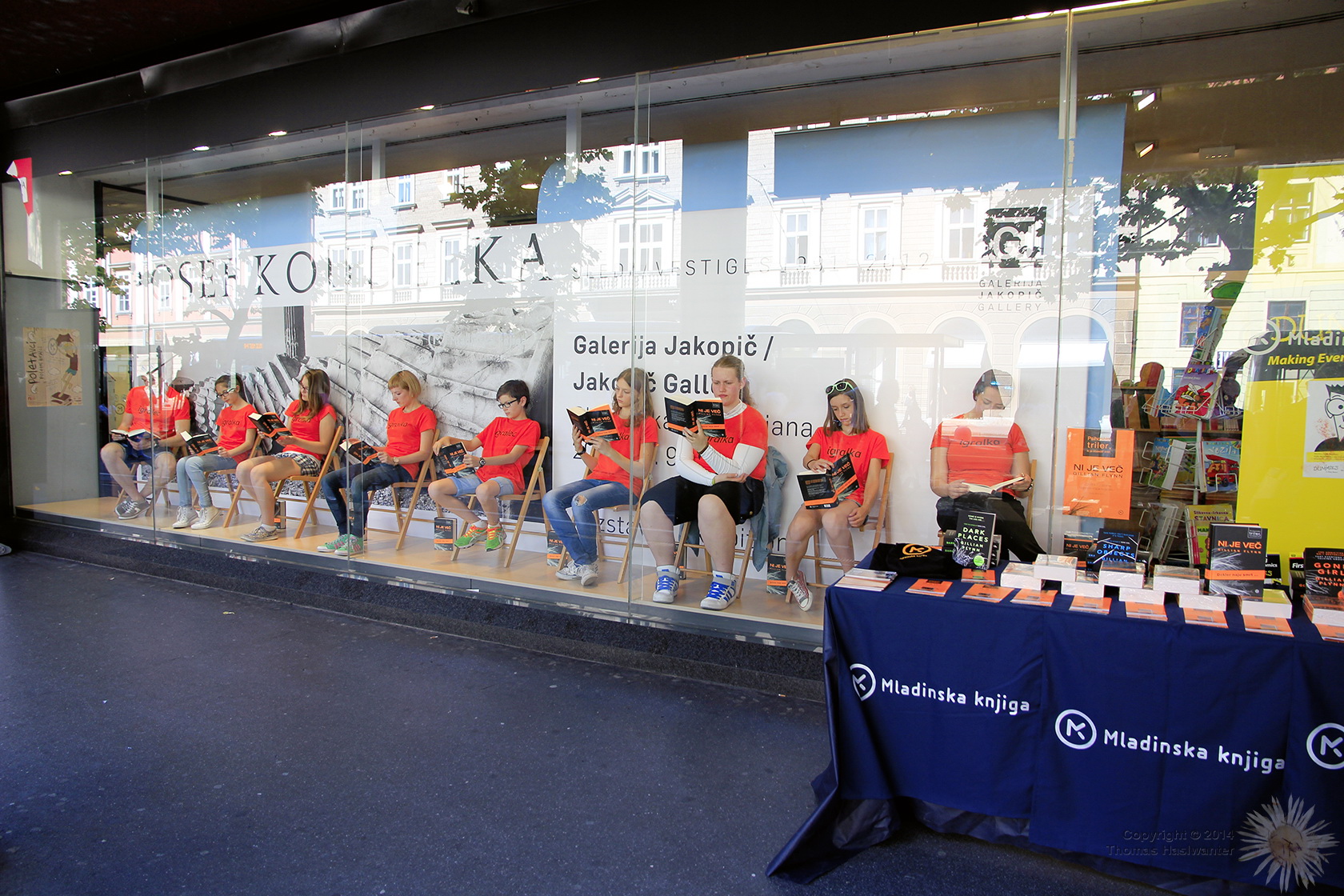 Creative advertising by a bookstore: 10 people sitting in a display window, reading a crime novel.