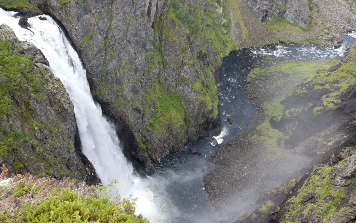 The Vøringsfossen waterfall drops 150m. To get an idea of the scale, have a look at the bridge (and the humans) in the top-right corner!